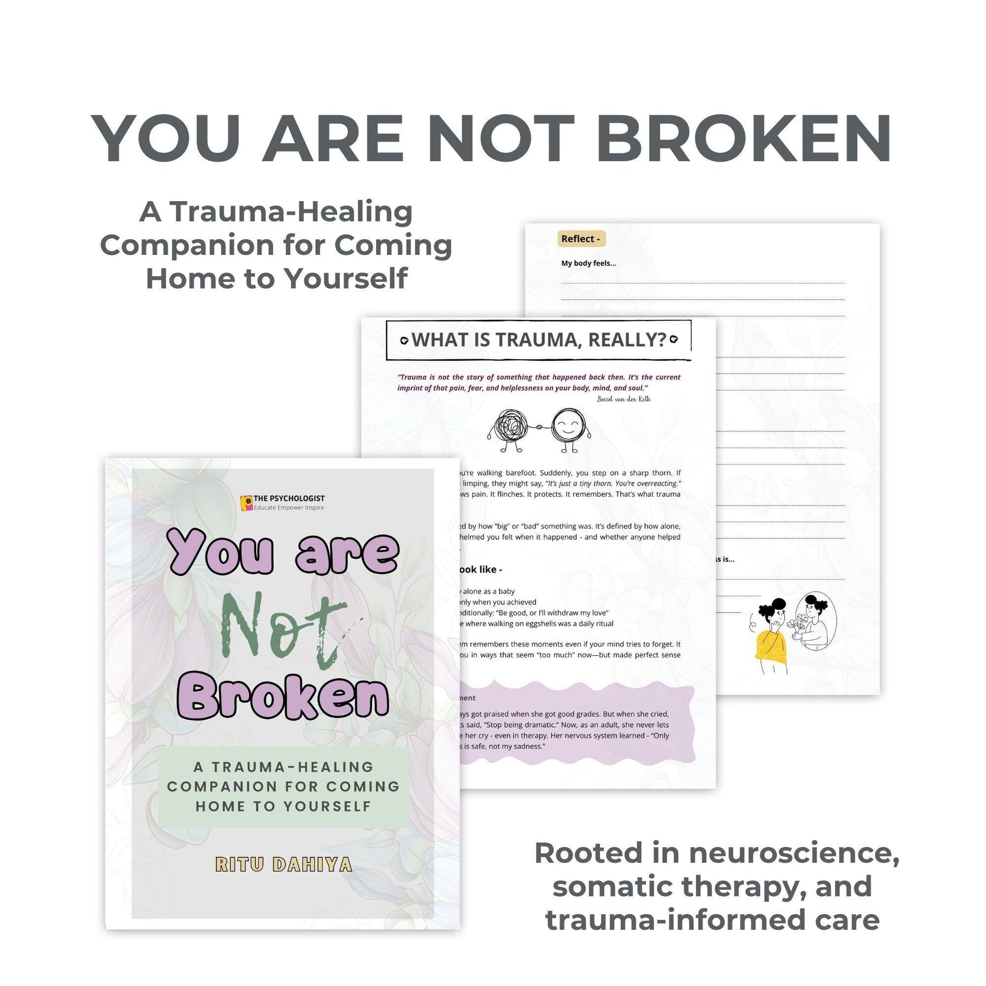Carefully crafted by Ritu Dahiya (trauma-informed psychologist), this soulful 46-page companion blends psychological wisdom, reflective prompts, nervous system insights, and calming rituals to support your journey home to yourself.